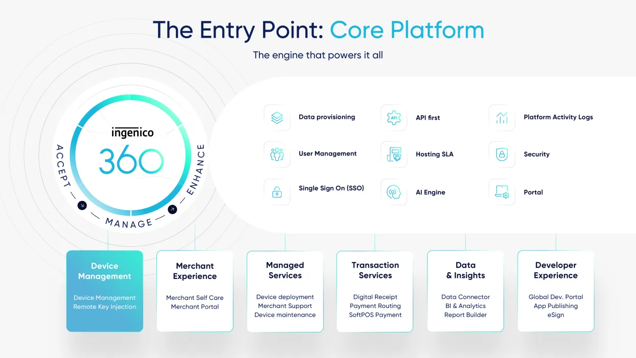 Ingenico 360 responde a estas necesidades con una plataforma en la nube diseñada para simplificar la operativa diaria, reducir la complejidad y permitir que los proveedores se adapten rápidamente a medida que evolucionan los ecosistemas de pago.